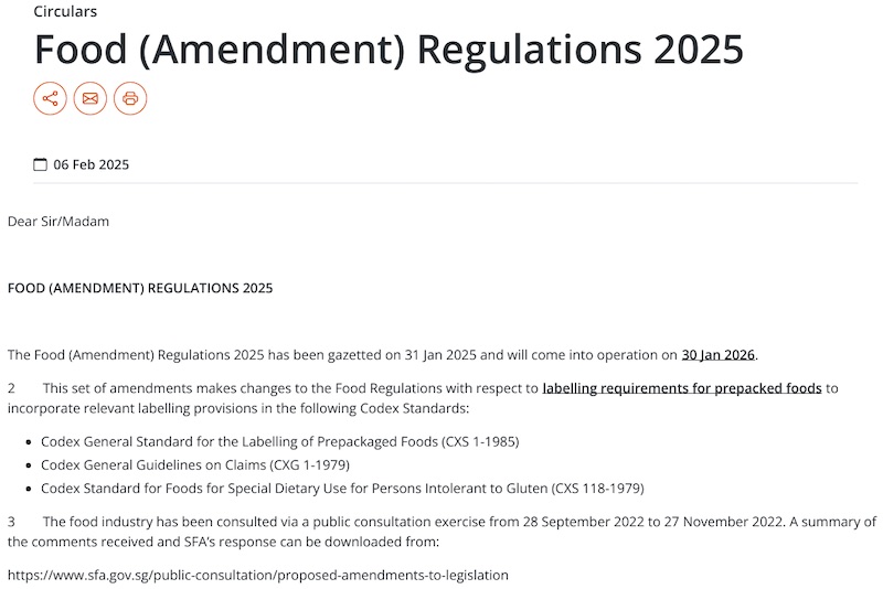 新加坡食品局(SFA)針對預包裝食品標簽要求對《食品條例》進行了修訂,《2025年食物(修訂)規(guī)例》已于2025年1月31日刊憲,并將于2026年1月30日生效。該更新參考了Codex(食品法典委員會)標準中的相關規(guī)定。