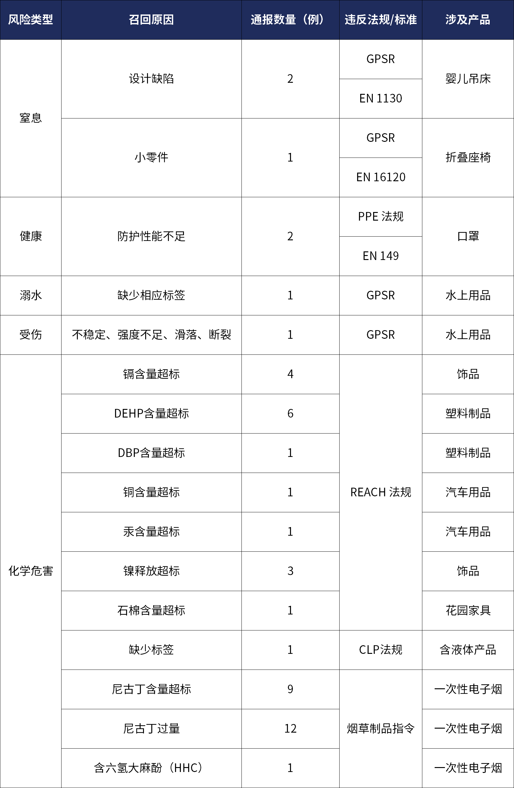 2025年7月,歐盟Rapex系統(tǒng)共召回36例消費(fèi)品(除玩具、電器及紡織品)。召回產(chǎn)品原產(chǎn)國方面,土耳其3例,波蘭、丹麥、西班牙、瑞士、捷克、比利時、德國各1例,1例來源不明,其余均為中國產(chǎn)品。其中7例珠寶首飾因鎳釋放量和鎘含量超標(biāo),違反REACH法規(guī),鎳釋放超標(biāo)可能引起過敏反應(yīng),鎘含量超標(biāo)會損害生殖系統(tǒng),造成健康風(fēng)險(xiǎn)。
