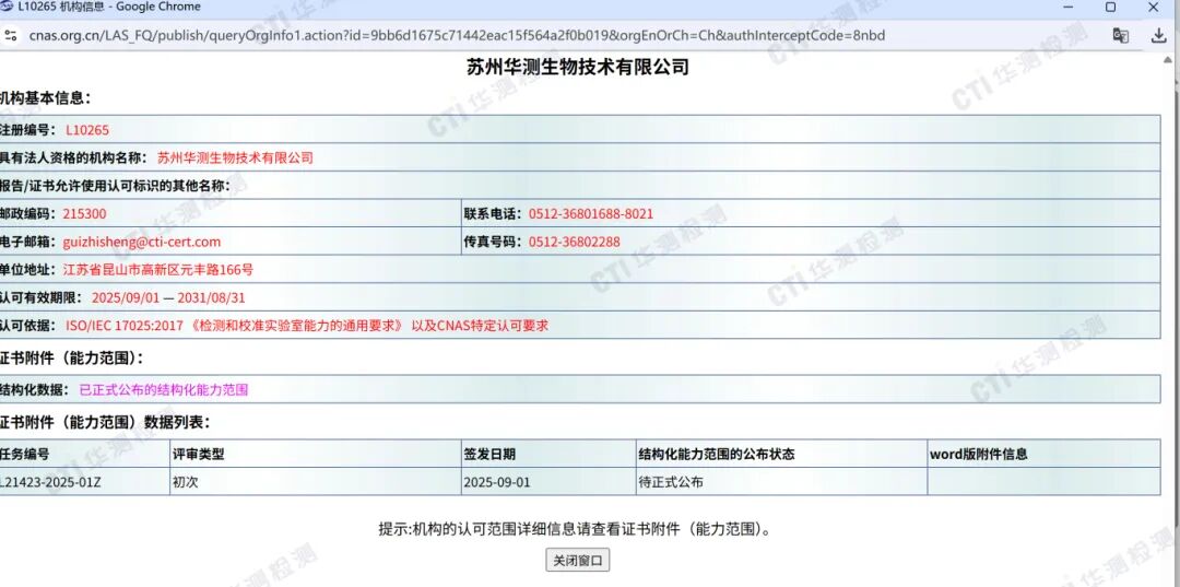 近日,華測(cè)檢測(cè)認(rèn)證集團(tuán)股份有限公司(如下簡稱“CTI華測(cè)檢測(cè)”)醫(yī)療器械檢測(cè)領(lǐng)域戰(zhàn)略布局迎來重磅突破! 旗下華測(cè)生物技術(shù)有限公司(如下簡稱“蘇州華測(cè)”)成功獲得國家認(rèn)證認(rèn)可監(jiān)督管理委員會(huì)(國家級(jí)CMA)和中國合格評(píng)定國家認(rèn)可委員會(huì)(CNAS)頒發(fā)的雙資質(zhì)證書,也是繼2025年3月,以設(shè)施、人員、管理體系全維度卓越表現(xiàn)斬獲FDA GLP 評(píng)審專家高度評(píng)價(jià)后,蘇州華測(cè)正式成為同時(shí)擁有CMA、CNAS資質(zhì)、符合FDA GLP要求的第三方醫(yī)療器械檢測(cè)機(jī)構(gòu)!