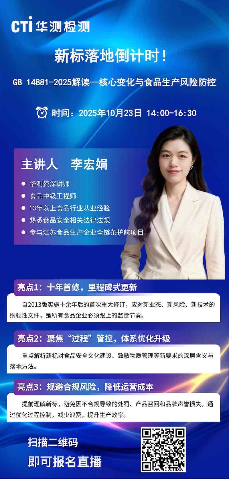 面對新標(biāo)帶來的多重挑戰(zhàn),食品生產(chǎn)企業(yè)亟需構(gòu)建科學(xué)、前瞻的食品安全管理體系。為助力企業(yè)精準(zhǔn)理解標(biāo)準(zhǔn)內(nèi)容、高效推進(jìn)體系升級,CTI華測檢測特推出GB 14881-2025專題培訓(xùn)。課程將聚焦標(biāo)準(zhǔn)核心變化與實施要點,并結(jié)合典型案例,剖析常見合規(guī)誤區(qū)與整改路徑。通過系統(tǒng)化、場景化的課程設(shè)計,助力企業(yè)筑牢食品安全防線,實現(xiàn)從“被動合規(guī)”到“主動管理”的跨越升級。